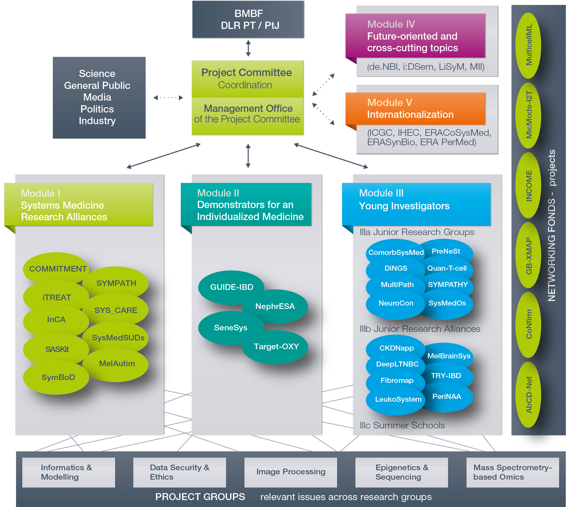 support the BMBF in organizational and functional implementation of project funding. In e:Med the Project Management Agency in the German Aerospace Center (PT-DLR) is responsible for modules I and III, as well as projects from module V (ICGC, IHEC and CSA PerMed), the Project Managment Jülich (PtJ) for modules II and IV, as well as projects from module V (CASyM, ERACoSysMed, ERASynBio).